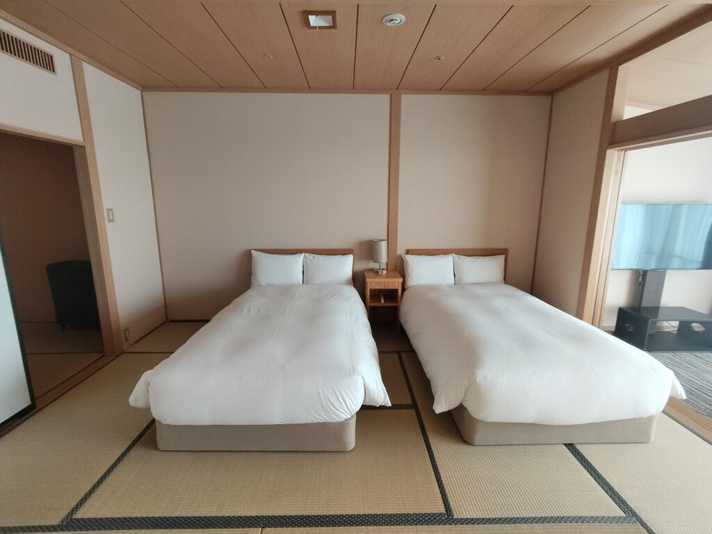 ベッドの様子。広縁にテレビがあります。